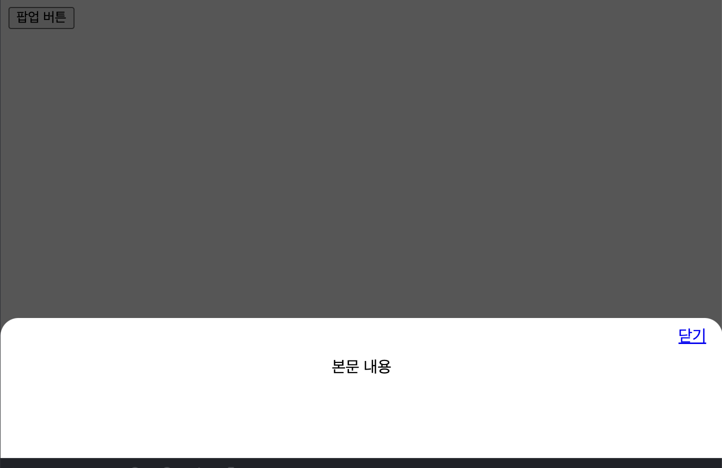 각각의 버튼과 Dim 영역에 클릭 이벤트 리스너를 등록해 주었습니다. '팝업 버튼'이 클릭되면 showPop 함수가 호출되어 팝업이 나타나고, '닫기' 버튼이나 Dim 영역이 클릭되면 hidePop 함수가 호출되어 팝업이 사라집니다. 이렇게 함으로써 사용자는 버튼을 클릭함으로써 팝업을 제어할 수 있도록 구현하였습니다.