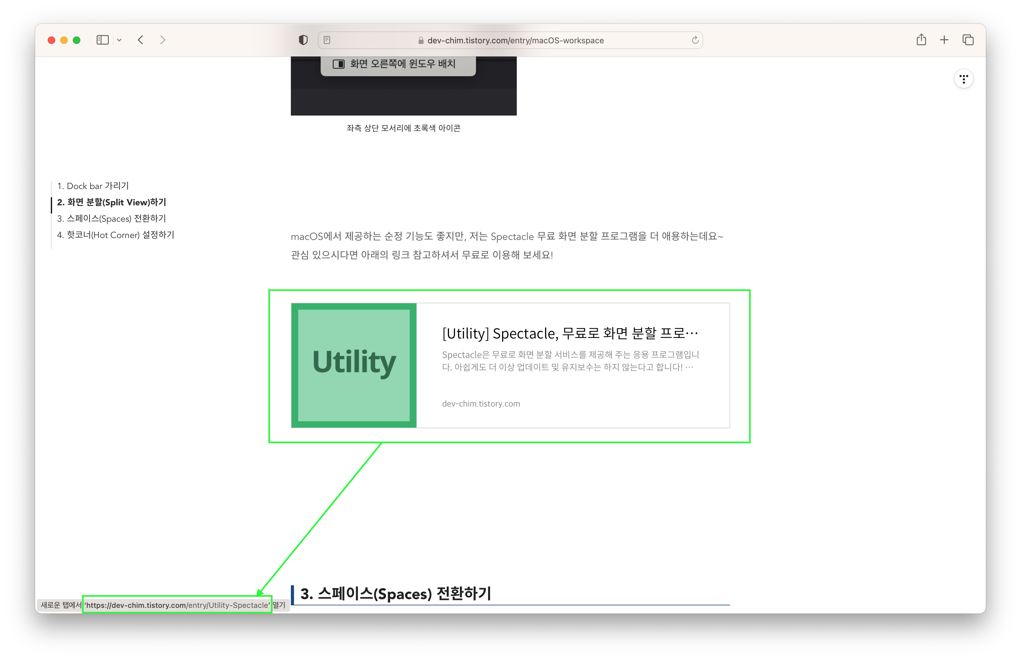 웹 페이지 내의 링크(link)에 마우스를 호버(hover)하면, 링크에 대한 주소 정보를 좌측 하단에서 손쉽게 확인할 수 있습니다.