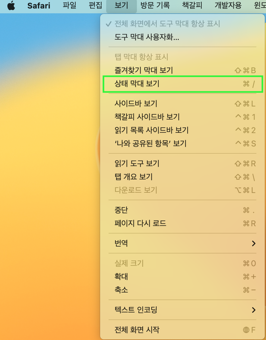 Safari > 보기 > 상태 막대 보기를 클릭합니다.