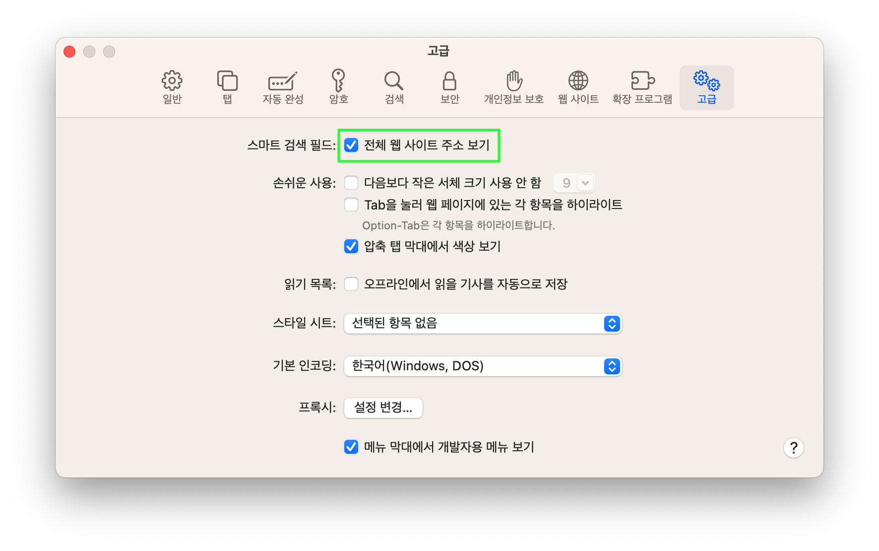 Safari는 기본 설정이 웹사이트 전체 보기를 제공하지 않더라고요~ 따로 설정을 통해 주소를 보다 명확하게 확인해 봅시다.
